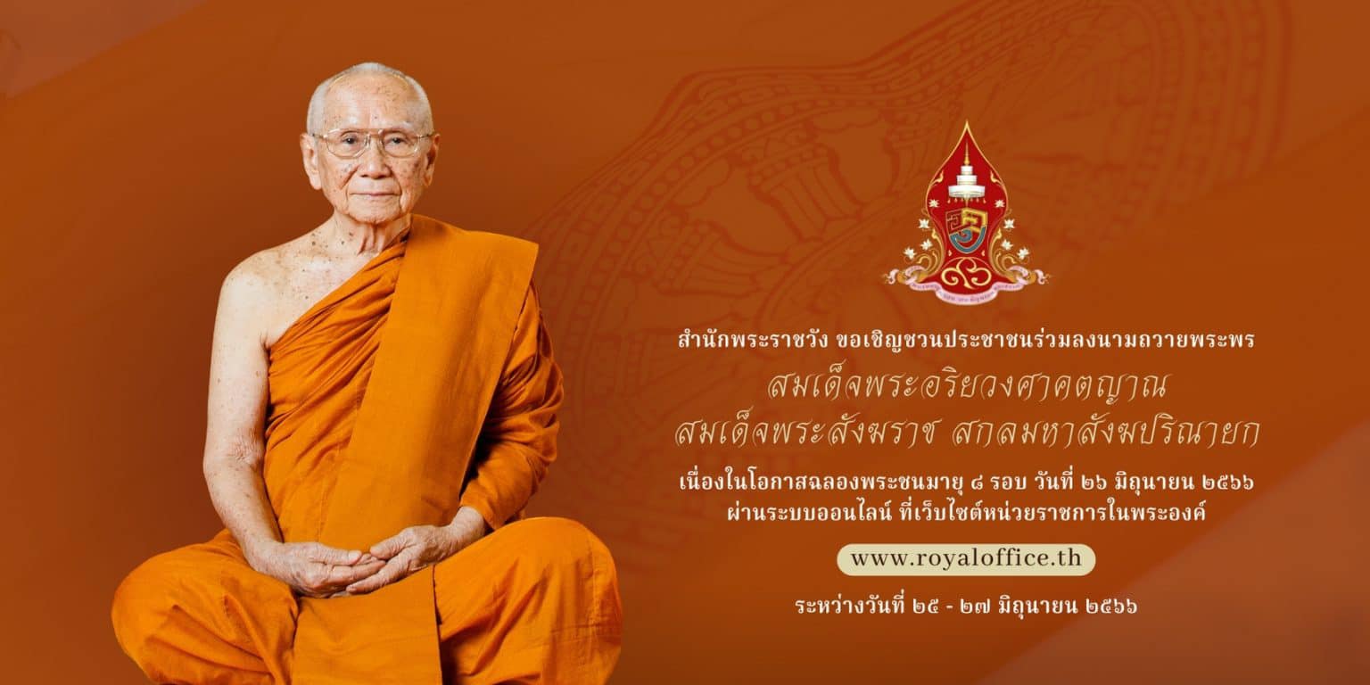 สำนักพระราชวัง ขอเชิญชวนประชาชนร่วมลงนามถวายพระพร สมเด็จพระอริยวงศาคตญาณ สมเด็จพระสังฆราช สกลมหาสังฆปริณายก เนื่องในโอกาสฉลองพระชนมายุ ๘ รอบ วันที่ ๒๖ มิถุนายน ๒๕๖๖ ผ่านระบบออนไลน์ ที่เว็บไซต์หน่วยราชการในพระองค์